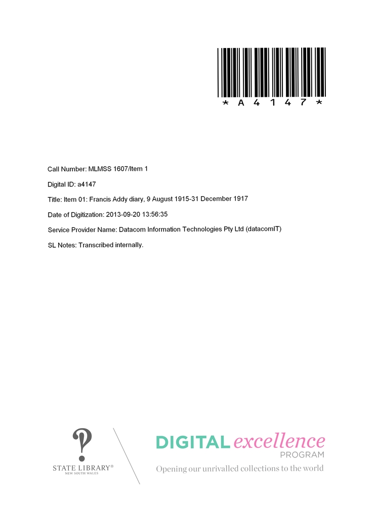 Item 01: Francis Addy diary, 9 August 1915-31 December 1917