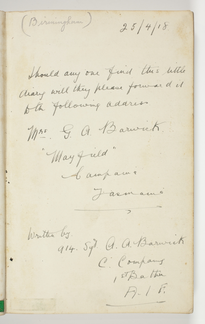 Item 13: Archie Barwick diary, 25 April-19 June 1918