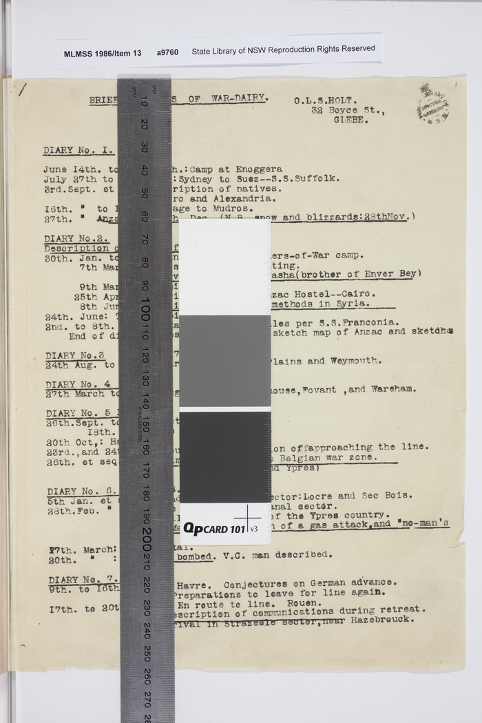 Item 13: Brief synopsis of war diary / O. L. S. Holt, 1920?