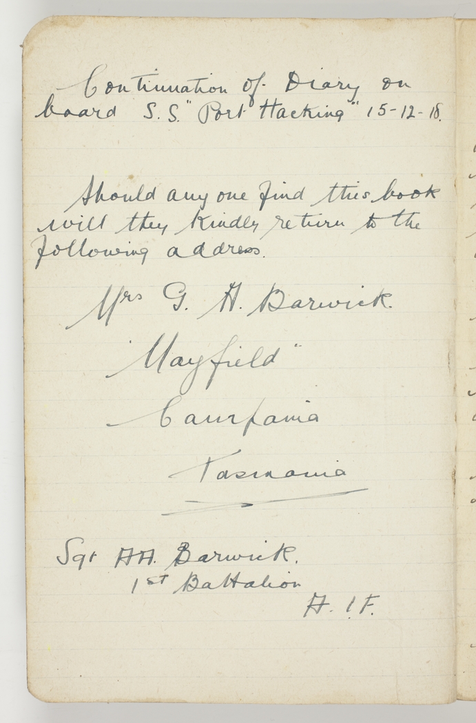 Item 16: Archie Barwick diary, 15 December 1918-26 January 1919
