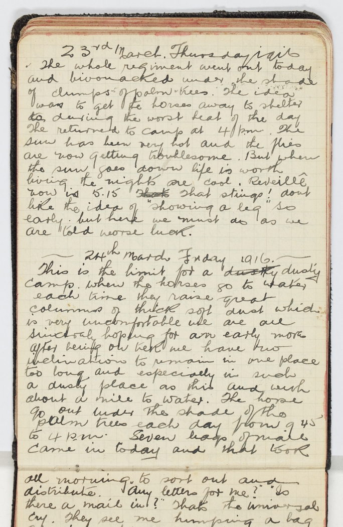 The whole Regiment went out today and bivouacked under the shade of clumps of palm-trees. The idea was to get the horses away to shelter to during the worst heat of the day. The returned to Camp at 4 p.m. The sun has been very hot and the flies are now getting troublesome. But when the sun goes down life is worth living the nights are cool. Reveille now is 5.15 Thats That stings! don't like the idea of "showing a leg" so early. but here we must do as we are told worse luck.