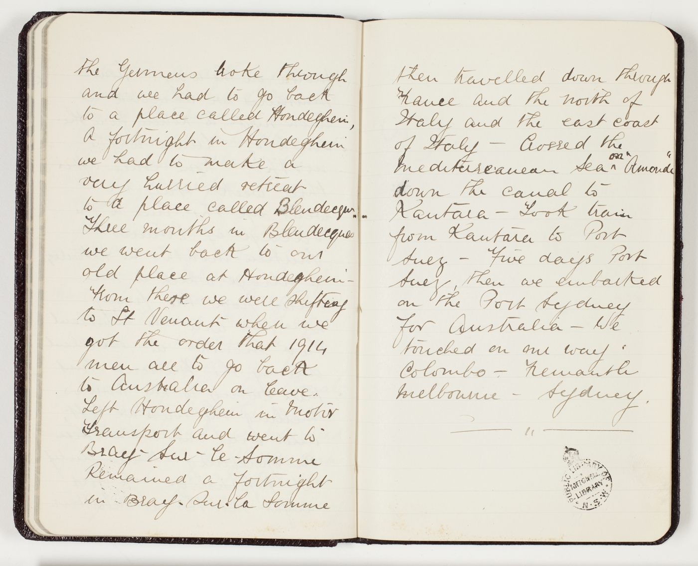 the Germans broke through and we had to go back to a place called Hondeghem. A fortnight in Hondeghem we had to make a very hurried retreat to a place called Blendecques. Three months in Blendecques we went back to our old place at Hondeghem – From there we were shifting to St. Venant when we got the order that 1914 men are to go back to Australia on leave. Left Hondeghem in Motor Transport and went to Bray-sur-le-Somme [Bray sur Somme]. Remained a fortnight in Bray-sur-la-Somme then travelled down through France and the north of Italy and the east coast of Italy – Crossed the Mediterreanean [Mediterranean] Sea on "Ormonde" down the canal to Kantara – Took train from Kantara to Port Suez – Five days Port Suez, then we embarked on the Port Sydney for Australia – We touched on our way Colombo – Fremantle – Melbourne – Sydney.