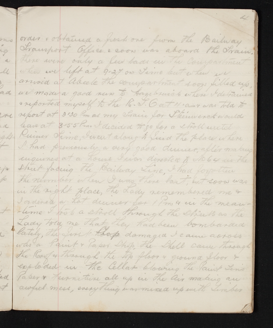 order & obtained a fresh one from the Railway Transport Office & soon was aboard the Train. There were only a few lads in the Compartment when we left at 9.27 on Time but when we arrived at Abeele the compartment soon filled up, we made a good run to Hazebruick when I detrained & reported myself to the R.T.O. at 11.am & was told to report at 3.30 Pm as my Train for Steinwerck would leave at 3.55 Pm. I decided to go for a stroll until Dinner Time, I went along to find the place where I had previously a very good dinner. After making inquiries at a house I was directed to No 64 in the Street facing the Railway Line. I had forgotten the number when I was there last, but soon was in the right place, The Lady remembered me & I ordered a hot dinner for 1 Pm & in the meantime I took a stroll through the streets as the Lady told me that they had been bombarded lately. The first shop damage I came across was a Paint & Paper Shop, the Shell came through the Roof & through the top floor & ground floor & exploded in the Cellar blowing the Paint Tins Paper & Furniture all up in the air making an awful mess, everything was mixed up with Timber