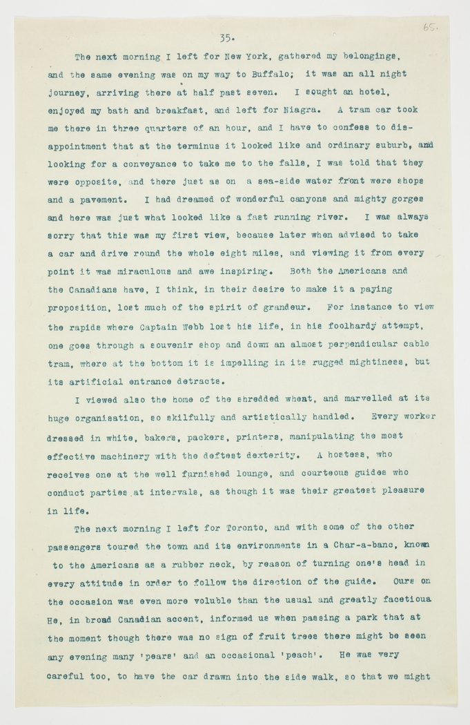The next morning I left for New York, gathered my belongings, and the same evening was on my way to Buffalo;  it was an all night journey, arriving there at half past seven.  I sought an hotel, enjoyed my bath and breakfast, and left for Niagara.  A tram car took me there in three quarters of an hour, and I have to confess to disappointment that at the terminus it looked like an ordinary suburb, and looking for a conveyance to take me to the falls, I was told that they were opposite, and there just as on a sea-side water front were shops and a pavement.  I had dreamed of wonderful canyons and mighty gorges and here was just what looked like a fast running river.  I was always sorry that this was my first view, because later when advised to take a car and drive round the whole eight miles, and viewing it from every point it was miraculous and awe inspiring.  Both the Americans and the Canadians have, I think, in their desire to make it a paying proposition, lost much of the spirit of grandeur.  For instance to view the rapids where Captain Webb lost his life, in his foolhardy attempt, one goes through a souvenir shop and down an almost perpendicular cable tram, where at the bottom it is impelling in its rugged mightiness, but its artificial entrance detracts.