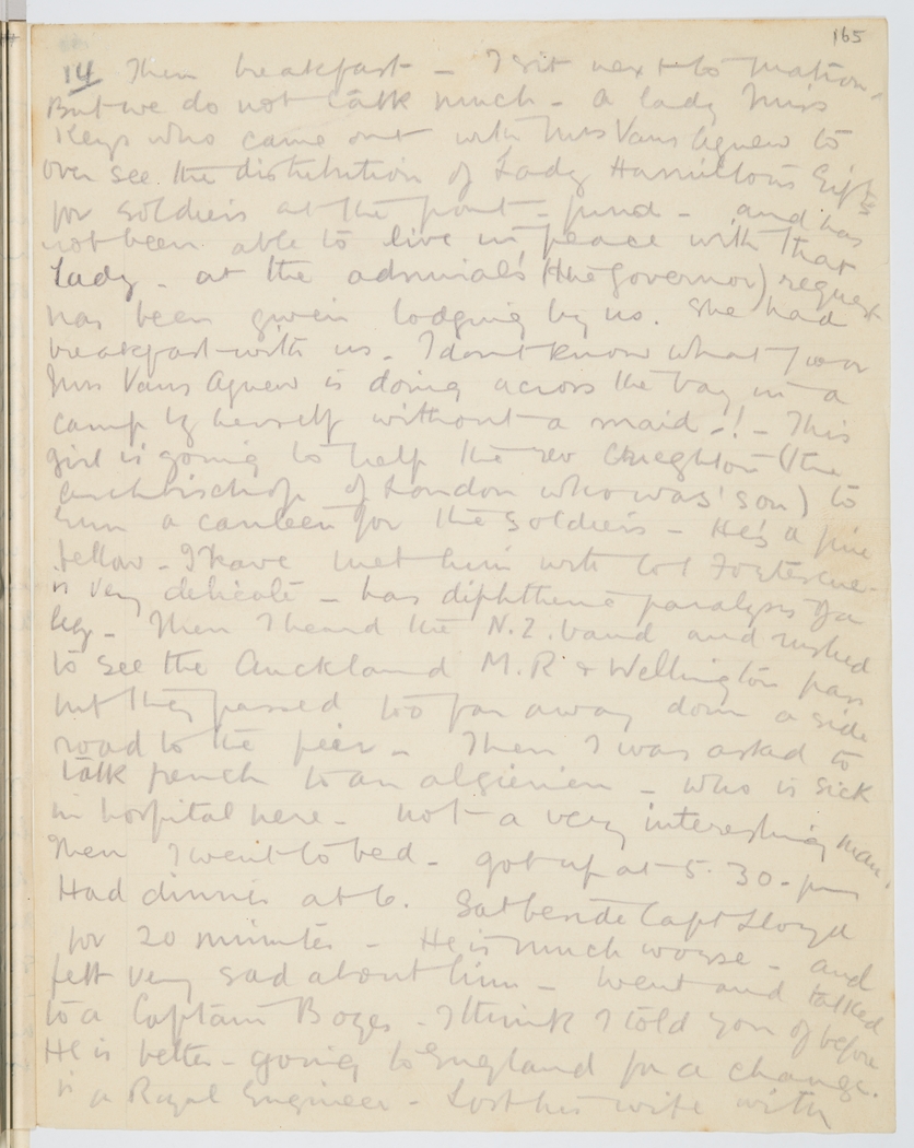 14 – Then breakfast. I sit next to Matron But we do not talk much – a lady Miss Keys who came out with Mrs Vans Agnew to over see the distribution of Lady Hamilton's Gifts for soldiers at the front – fund – and has not been able to live in peace with that Lady – at the admiral's (the Governor) request has been given lodging by us. She had breakfast with us. I don't know what your Mrs Vans Agnew is doing across the bay in a camp by herself without a maid! This girl is going to help the rev Crieghton – (the Archbishop of London who was son) to run a canteen for the soldiers. He's a fine fellow – I have met him with Col Fortescue – is very delicate – has dipthen paralysis of a leg. Then I heard the N.Z. band and rushed to see the Auckland M.R. & Wellington pass but they passed too far away down a side road to the pier. Then I was asked to talk French to an Algerian – who is sick in hospital here – not very interesting man. Then I went to bed – got up at 5.30 pm. Had dinner at 6. Sat beside Capt Lloyd for 20 minutes. He is much worse – and felt very sad about him – went and talked to Captain Boyes – I think I told you of before is a Royal Engineer. Lost his wife with