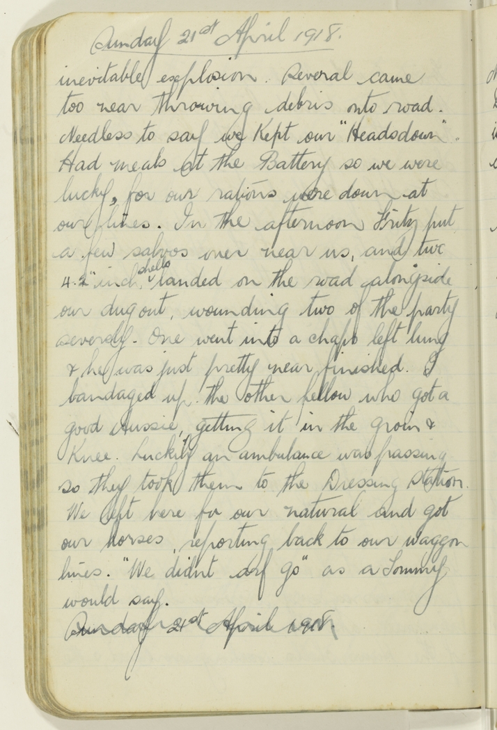inevitable explosion. Several came too near throwing debris onto road. Needless to say we Kept our "Headsdown". Had meals at the Battery so we were lucky, for our rations were down at our lines. In the afternoon Fritz put a few salvos over near us, and two 4.2" shells landed on the road alongside our dugout, wounding two of the party severely. One went into a chaps left lung & he was just pretty near finished. I bandaged up the other fellow who got a good Aussie, getting it in the groin & knee. Luckily an ambulance was passing so they took them to the Dressing Station. We left here for our natural and got our horses, reporting back to our waggon lines. "We didn't arf go" as a Tommy would say.