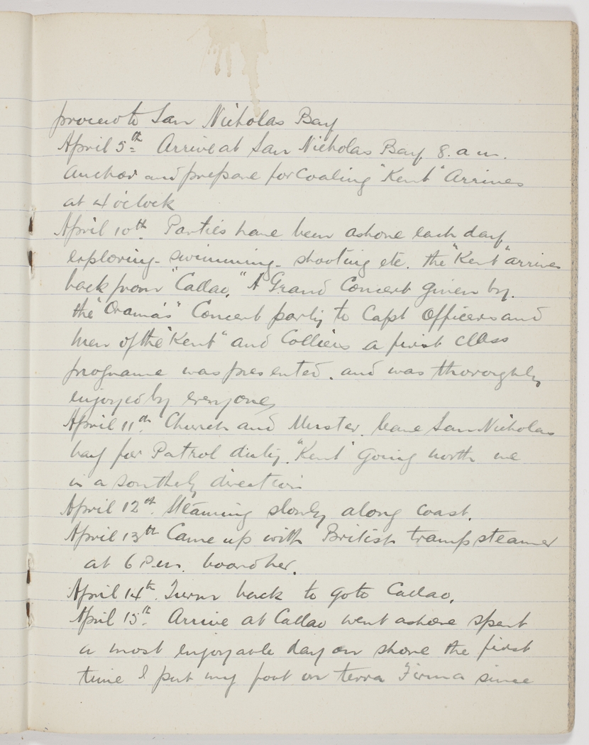 April 10th Parties have been ashore each day exploring swimming shooting etc. the "Kent" arrives back from "Callao". A Grand Concert given by the "Orama's" Concert party to Capt Officers and men of the "Kent" and Colliers a first class programme was presented and was thoroughly enjoyed by everyone