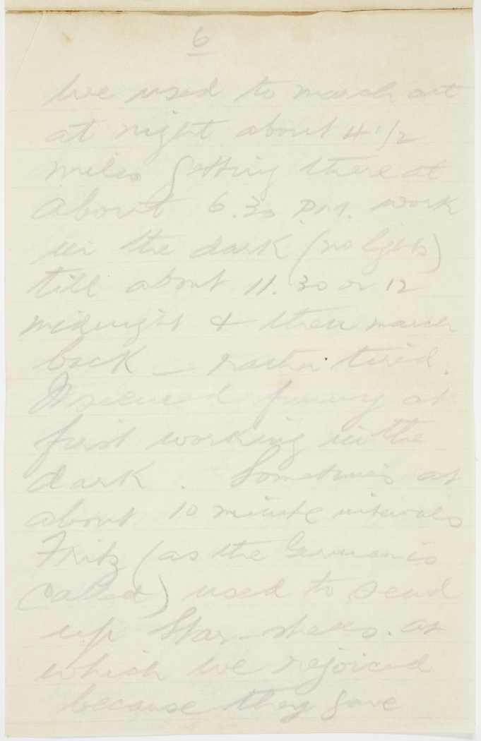 We used to march out at night about 4½ miles getting there at about 6.30 P.M. work in the dark (no lights) till about 11.30 or 12 midnight & then march back – rather tired. It seemed funny at first working in the dark. Sometimes at about 10 minute intervals Fritz (as the German is called) used to send up Star-shells. At which we rejoiced because they gave