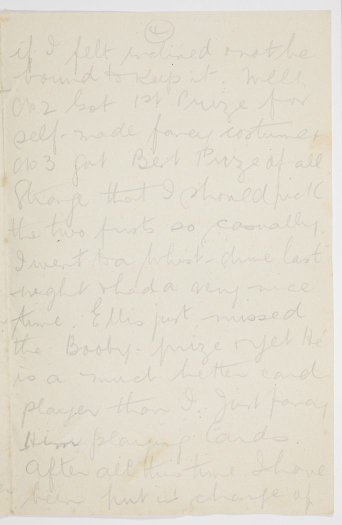 if I felt inclined & not be bound to keep it. Well, No. 2 Got 1st Prize for self-made fancy costume & No. 3 got Best Prize of all. Strange that I should pick the two firsts so casually. I went to a Whist-drive last night & had a very nice time. Ellis just missed the Booby prize & yet He is a much better card player than I. Just fancy Him playing Cards. After all this time I have been put in charge of