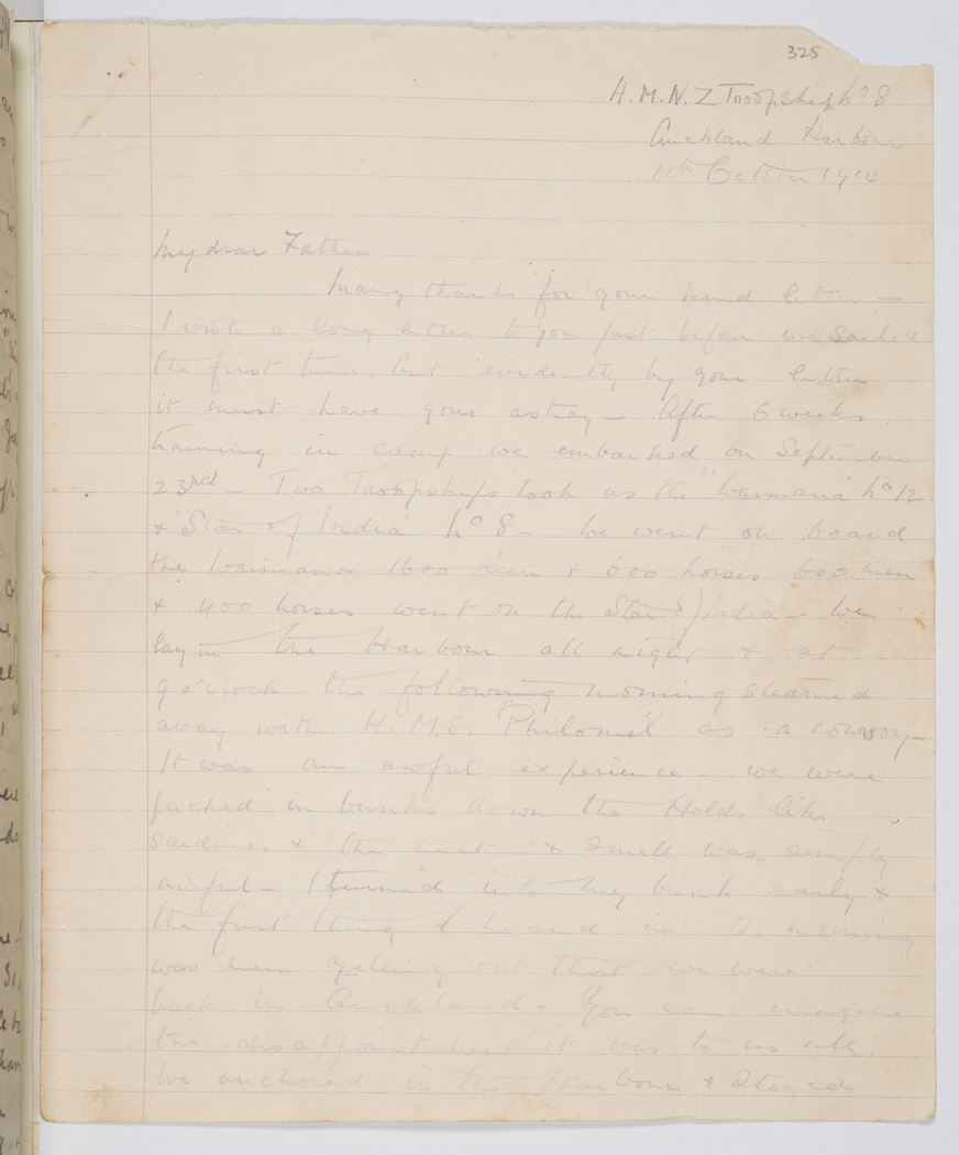 Many thanks for your kind letter- I wrote a long letter to you just before we sailed the first time, but evidently by your letter it must have gone astray- After 6 weeks training in camp we embarked on September 23rd- two troopships took us the "Waismana" No 12 & "Star of India" No 8- We went on board the Waismana 1600 men & 600 horses. 600 men & 400 horses went on the Star of India. We lay in the Harbour all night & at 9 o'clock the following morning steamed away with H.M.S. "Philomel" as a convoy. It was an awful experience we were packed in bunks down the Hold's like sardines & the heat & smell was simply awful- I turned into my bunk early & the first thing I heard in the morning was men yelling out that we were back in Auckland- You can imagine the disappointment it was to us all. We anchored in the Harbour & stayed
