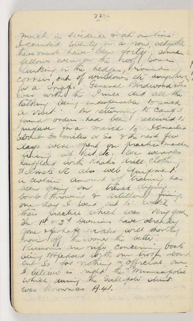 much in evidence & at one time I counted twenty in a row, altogether there must have been forty, some fellows even on the roof, some lurking in the hedges, round corners, out of windows etc. anywhere for a snap. General Birdwood who was with the Prince did all the talking being indispensable to such a visit. On returning to camp I found orders had been received to prepare for a march to Ismailia about 30 miles or so & the next few days were spent on practice marches fixing up kit etc. We were also supplied with khaki drill clothing Helmets etc also web equipment. A certain amount of training has been going on, trench digging bomb throwing & artillery firing. One day I went out to watch their practice which was very good. The 1st & 2nd Divisions have already gone & perhaps we also will shortly move off, the sooner the better. Rumours are rife concerning boats being torpedoed with our troops aboard but so far nothing is official one I believe is right the "Minneapolis" which during the Gallipoli stunt was known as A.41.