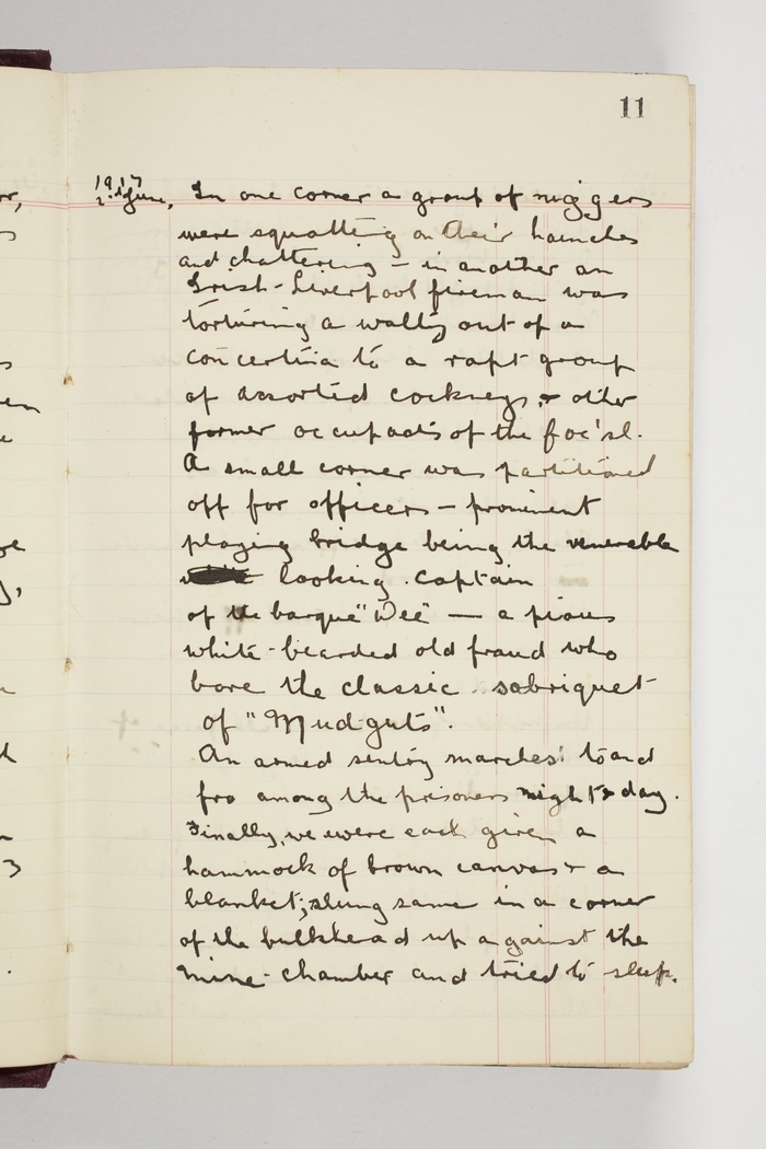 An armed sentry marches to and fro among the prisoners night & day. Finally, we were each given a hammock of brown canvas & a blanket; slung same in a corner of the bulkhead up against the mine-chamber and tried to sleep.