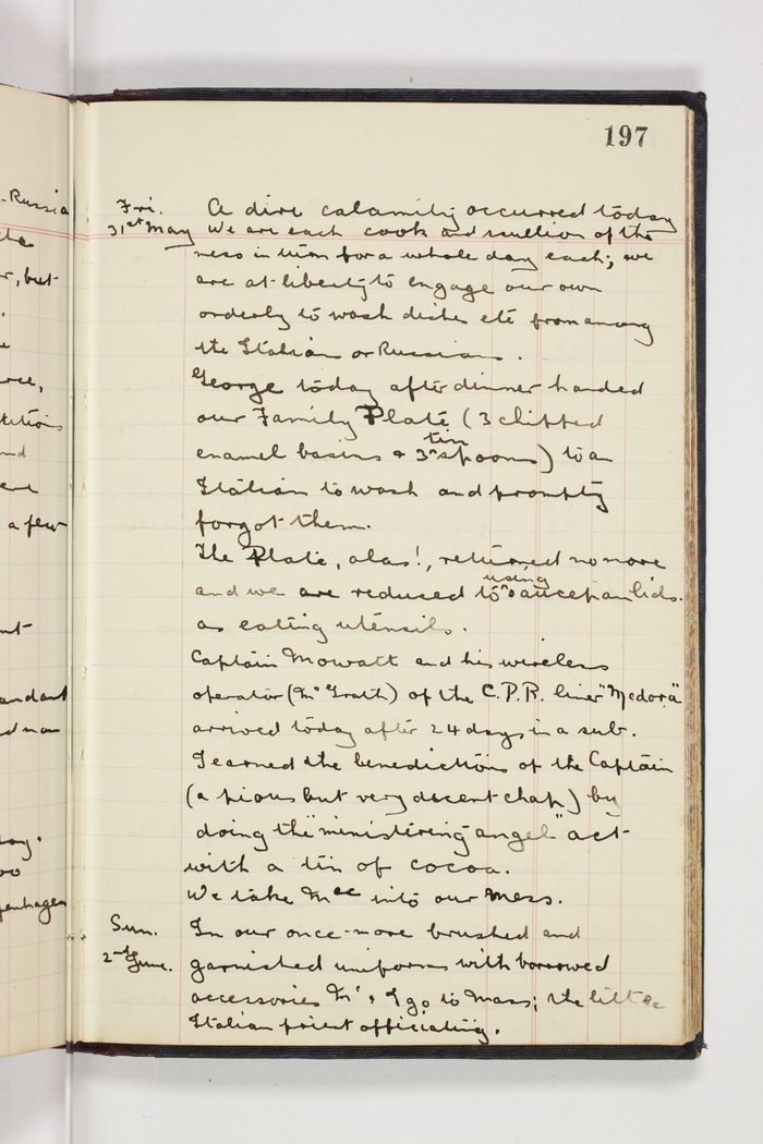 A dire calamity occurred today. We are each cook and scullion of the mess in turn for a whole day each; we are at liberty to engage our own orderly to wash dishes etc from among the Italian or Russians.