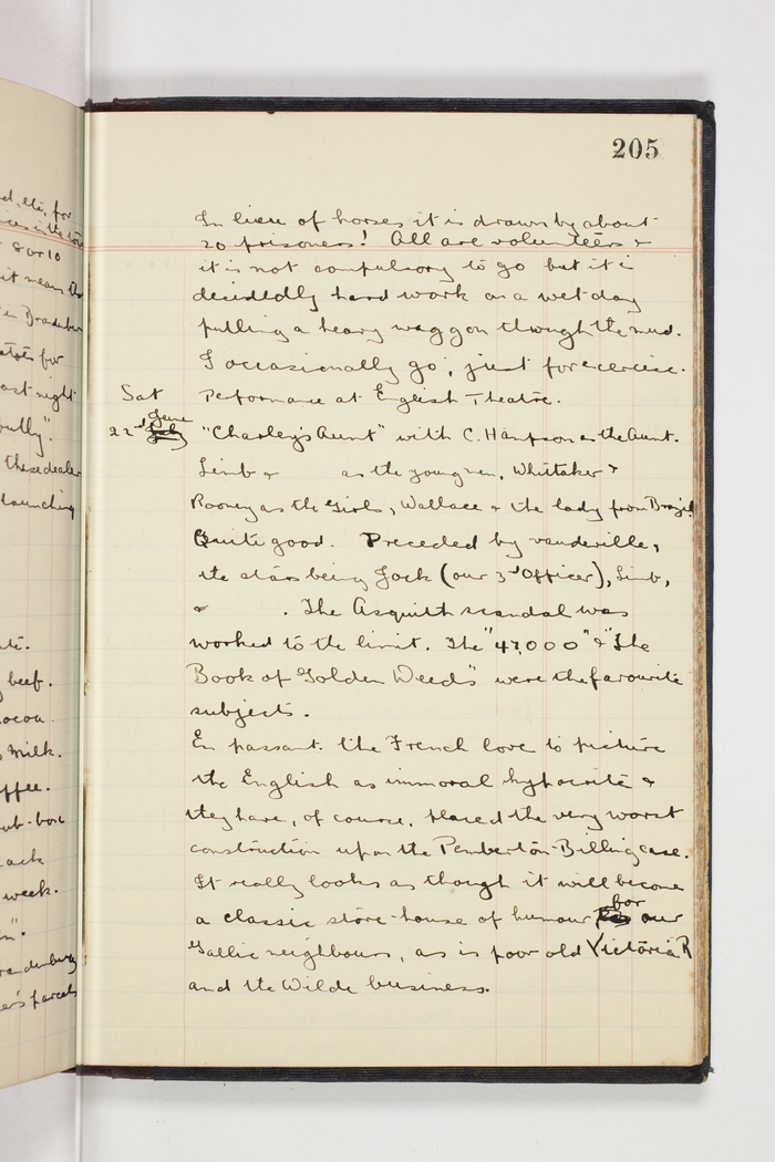 "Charley's Aunt" with C. Hampson as the Aunt. Limb & as the young men, Whittaker & Rooney as the Girls, Wallace & the lady from Brazil. Quite good. Preceded by vaudeville, the stars being Jock (our 3rd Officer), Limb, & . The Asquith scandal was worked to the limit. The "47,000" & "The Book of the Golden Deeds" were the favourite subjects.