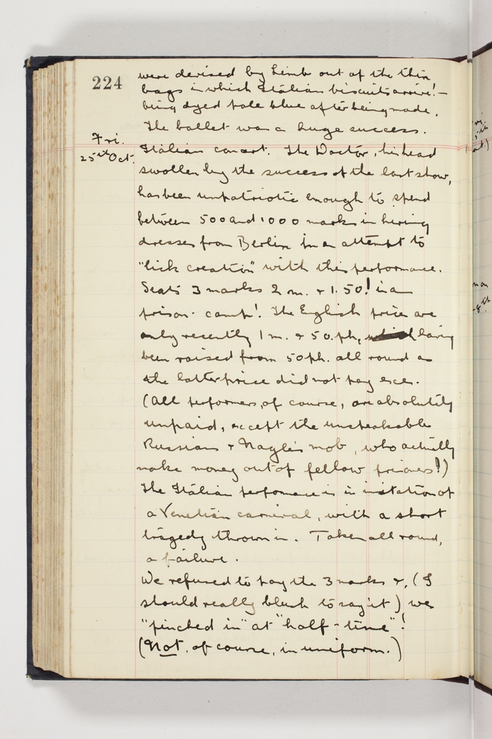 Italian concert. The Doctor, his head swollen by the success of the last show, has been unpatriotic enough to spend between 500 and 1000 marks in hiring dresses from Berlin in an attempt to "lick creation" with this performance. Seats 3 marks 2 m. & 1.50! in a prison camp! The English prices are only recently 1 m. & 50. ph. having been raised from 50 ph. all round as the latter price did not pay exes. (All performers, of course, are absolutely unpaid, except the unspeakable Russians & Nagle's mob, who actually make money out of fellow prisoners!). The Italian performance is in imitation of a Venetian carnival, with a short tragedy thrown in. Taken all round, a failure.