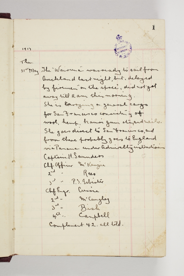 The "Wairuna" was ready to sail from Auckland last night, but, delayed by firemen "on the spree", did not get away till 2 am this morning. She is carrying a general cargo for San Francisco as consisting of wool, hemp, kauri gum etc, and nails. She goes direct to San Francisco, and from there probably goes to England via Panama under Admiralty instructions.