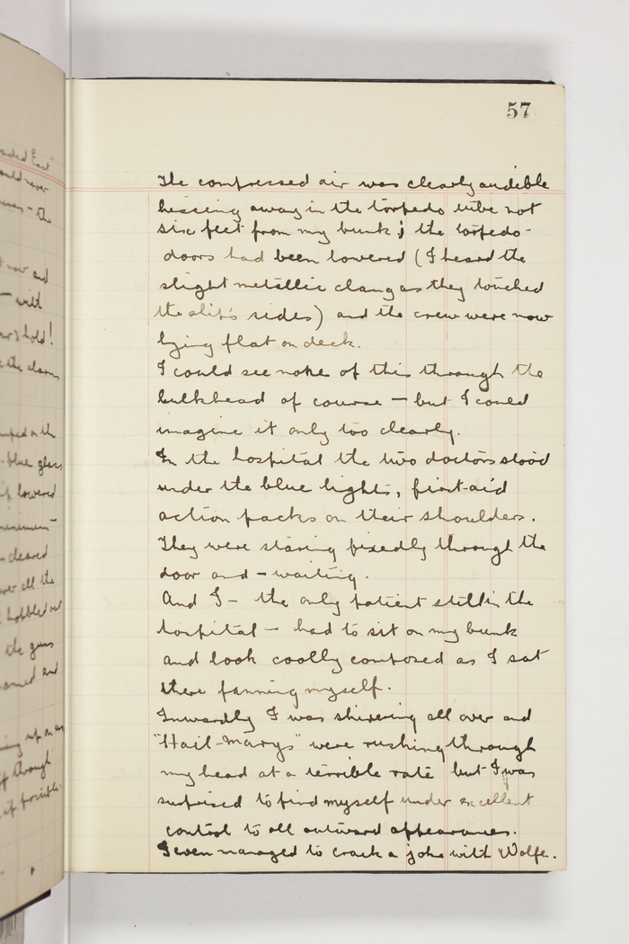 Inwardly I was shivering all over and "Hail-Marys" were rushing through my head at a terrible rate but I was surprised to find myself under excellent control to all outward appearances. I event managed to crack a joke with Wolfe.