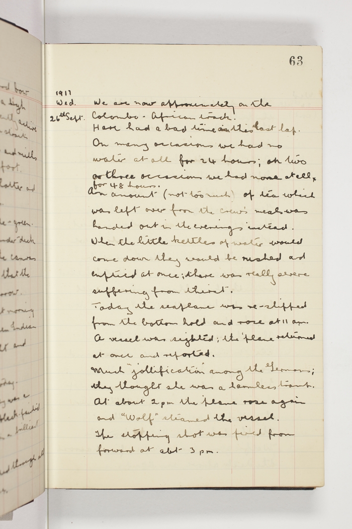 Have had a bad time on this last lap. On many occasions we had no water at all for 24 hours; on two or three occasions we had none at all for 48 hours. An amount (not too much) of tea which was left over from the crew's meals was handed out in the evenings instead. When the little kettles of water would come down they would be rushed and emptied at once; there was really severe suffering from thirst.