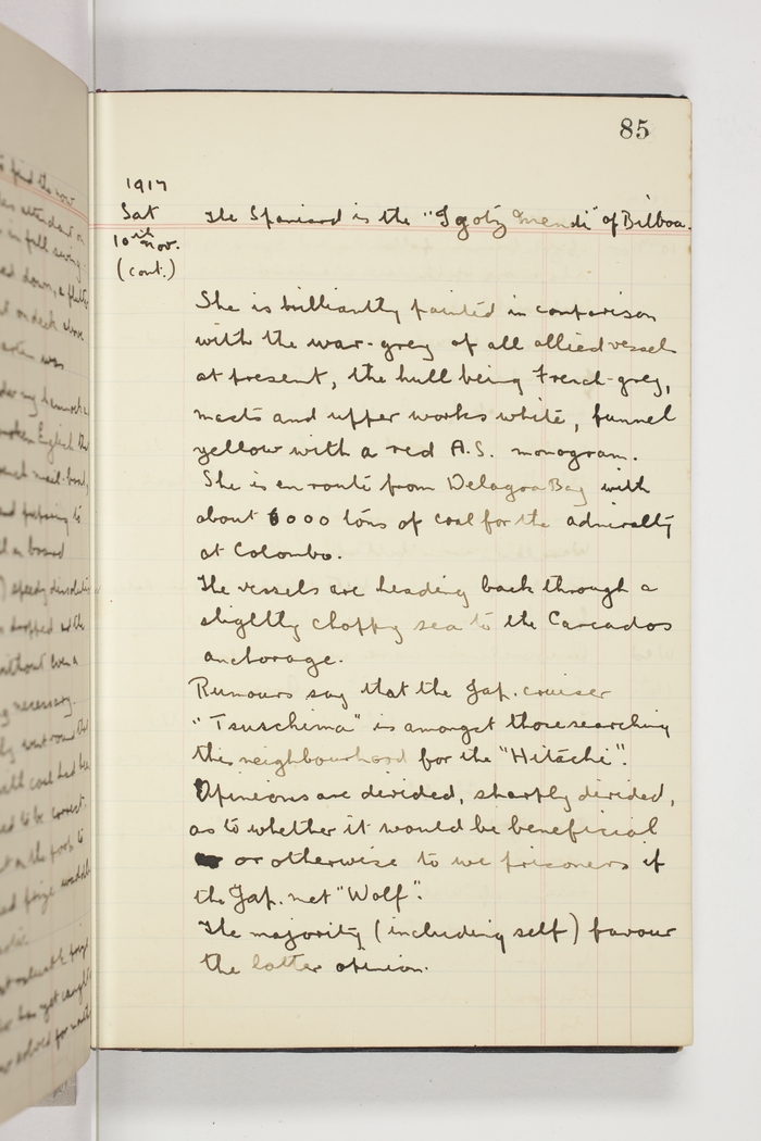 Rumours say that the Jap. cruiser "Tsuschima" is amongst those searching this neighbourhood for the "Hitachi". Opinions are divided, sharply divided, as to whether it would be beneficial or otherwise to we prisoners if the Jap. met "Wolf".