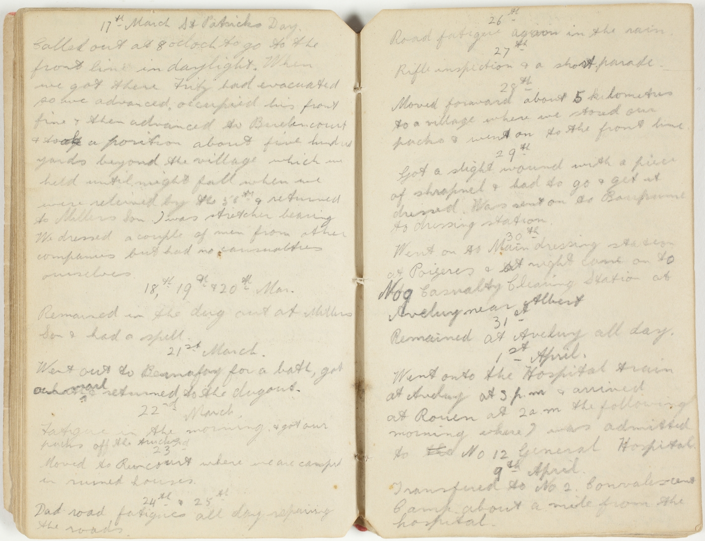 Called out at 8 o'clock to go to the front line in daylight. When we got there Fritz had evacuated so we advanced, occupied his front line & then advanced to Buelencourt & took a position about live hundred yards beyond the village which we held until night fall when we were relieved by the 56th & returned to Millers Son. I was stretcher bearing. We dressed a couple of men from other companies but had no casualties ourselves.