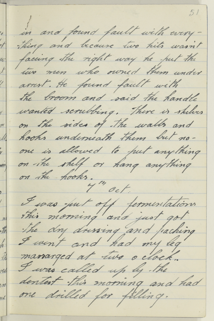 in and found fault with everything and because two kits was'nt faceing the right way he put the two men who owned them under arrest. He found fault with the broom and said the handle wanted scrubbing. There is shelves on the sides of the walls and hooks underneath them but no-one is allowed to put anything on the hooks.