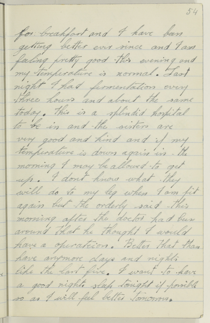 for breakfast and I have been getting better ever since and I am feeling pretty good this evening and my temperature is normal. Last night I had fermentation every three hours and about the same today. This is a splindid hospital to be in and the sisters are very good and kind and if my temperature is down again in the morning I may be allowed to get up. I dont know what they will do to my leg when I am fit again but the orderly said this morning after the doctor had been around that he thought I would have a operateion. Better that than have any more days and nights like the last five. I want to have a good nights sleep tonight if possible so as I will feel better tomorrow.