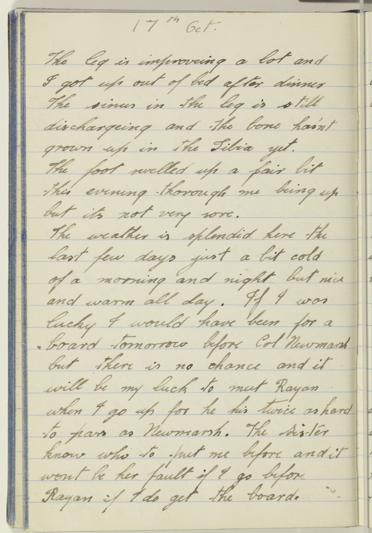 The weather is splendid here the last few days just a bit cold of a morning and night but nice and warm all day. If I was lucky I would have been for a board tomorrow before Col Newmarsh but there is no chance and it will be my luck to meet Rayan when I go up for he his twice as hard to pass as Newmarsh. The Sister know who to put me before and it wont be her fault if I go before Rayan if I do get the board.