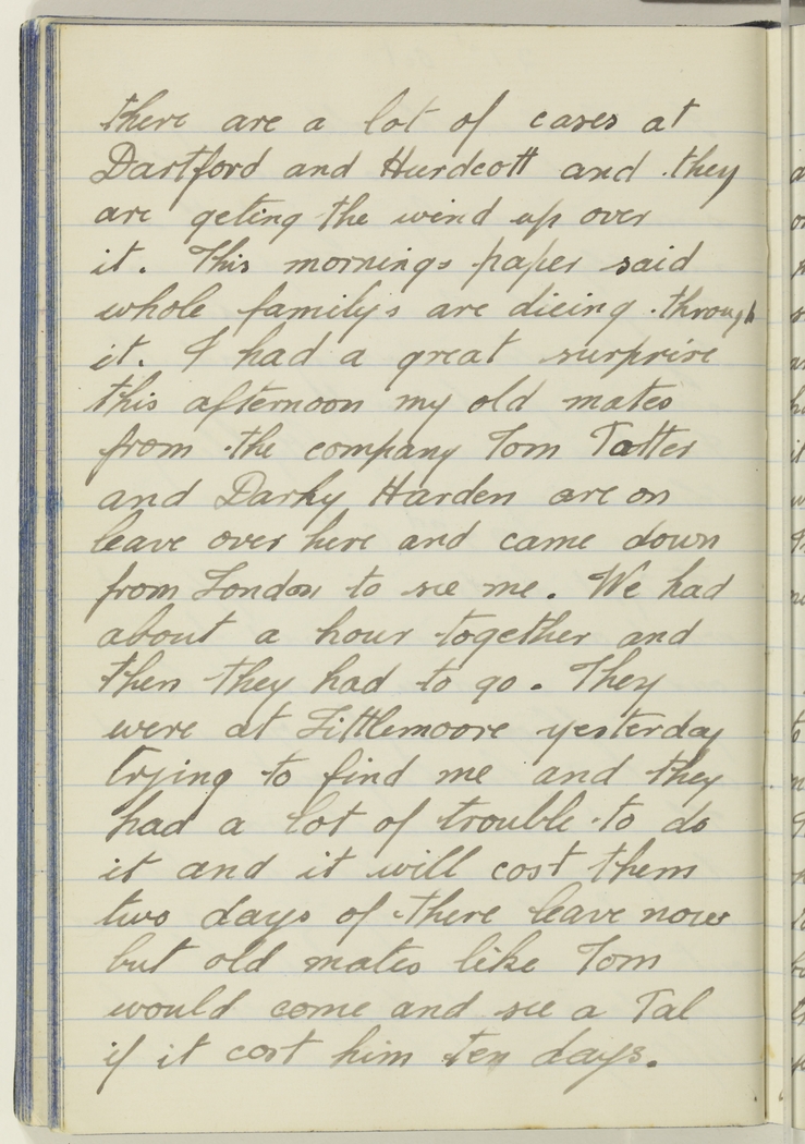 I had a great surprise this afternoon my old mates from the company Tom Potter and Darky Harden are on leave over here and came down from London to see me. We had about a hour together and then they had to go. They were at Littlemore yesterday trying to find me and they had a lot of trouble to do it and it will cost them two days of there leave now but old mates like Tom would come and see a Pal if it cost him ten days.