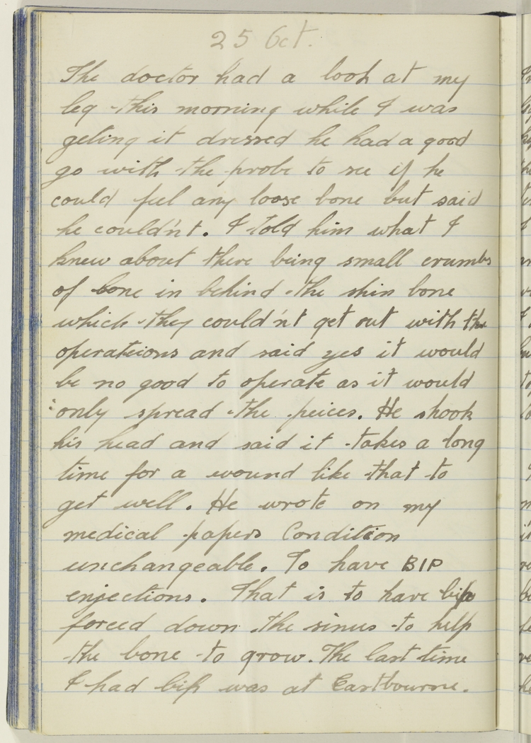The doctor had a look at my leg this morning while I was geting it dressed, he had a good go with the probe to see if he could feel any loose bone but said he could'nt. I told him what I knew about there being small crumbs of bone in behind the shin bone which they could'nt get out with the operateions and said yes it would be no good to operate as it would only spread the peices. He shook his head and said it takes a long time for a wound like that to get well. He wrote on my medical papers Condition unchangeable. To have BIP enjections. That is to have bip forced down the sinus to help the bone to grow. The last time I had bip was at Eastbourne.