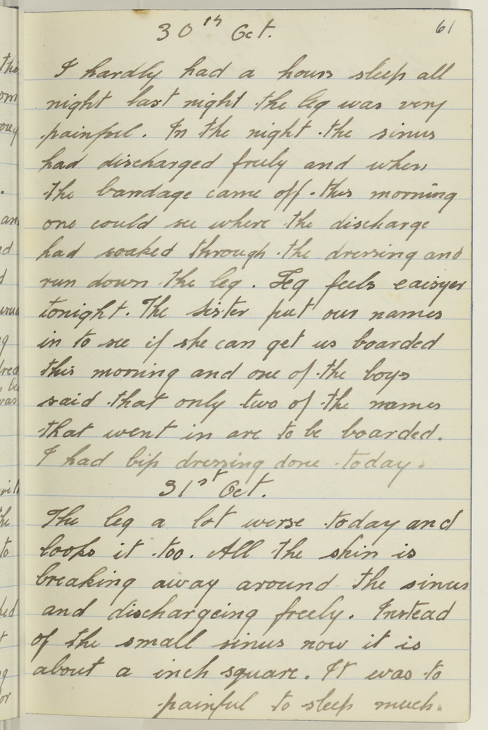 I hardly had a hours sleep all night last night the leg was very painful. In the night the sinus had discharged freely and when the bandage came off this morning one could see where the discharge had soaked through the dressing and run down the leg. Leg feels eaisyer tonight. The Sister put our names in to see if she can get us boarded this morning and one of the boys said that only two of the names that went in are to be boarded. I had bip dressing done today.