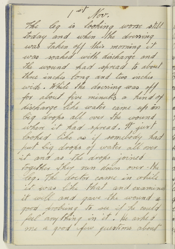 The leg is looking worse still today and when the dressing was taken off this morning it was soaked with discharge and the wound had spread to about three inches long and two inches wide. While the dressing was off for about five minutes a kind of discharge like water came up in big drops all over the wound where it had spread. It just looked like as if somebody had put big drops of water all over it and as the drops joined together they run down over the leg. The doctor came in while it was like that and examined it well and gave the wound a good probing to see if he could feel anything in it. He asked me a good few questions about