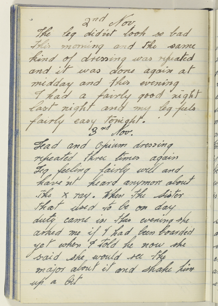 Lead and Opium dressing repeated three times again. Leg feeling fairly well and have'nt heard anymore about the X ray. When the Sister that used to be on day duty came in this evening she asked me if I had been boarded yet, when I told he now she said she would see the major about it and shake him up a bit.