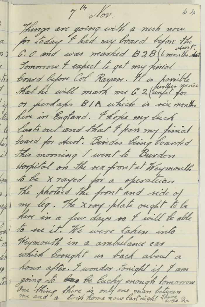 Things are going with a rush now for today I had my board before the C.O. and was marked B2B (6 months Aust.) Tomorrow I expect to get my finial board before Col Rayan. It is possible that he will mark me C2 (unfit for further service or perhaps B1A which is six months here in England. I hope my luck lasts out and that I pass my finial board for Aust. Besides being boarded this morning I went to Burdon Hospital on the sea front at Weymouth to be X rayed for a operation. The photo'ed the front and side of my leg. The X ray plate ought to be here in a few days so I will be able to see it. We were taken into Weymouth in a ambulance car which brought us back about a hour after. I wonder tonight if I am going to be lucky enough tomorrow. One thing there is only one man between me and a trip home now last night there was 2.