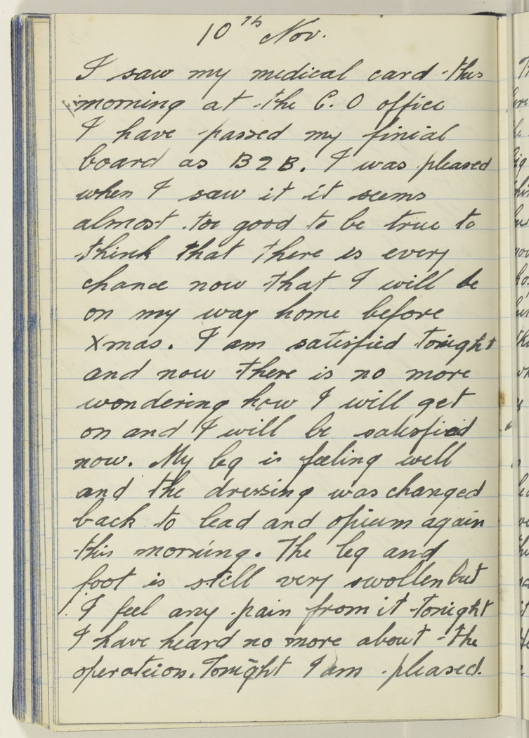 I saw my medical card this morning at the C.O. office. I have passed my finial board as B2B. I was pleased when I saw it it seems almost too good to be true to think that there is every chance now that I will be on my way home before Xmas. I am satisfied tonight and now there is no more wondering how I will get on and I will be satisfied now. My leg is feeling well and the dressing was changed back to lead and opium again this morning. The leg and foot is still very swollen but I feel any pain from it tonight. I have heard no more about the operateion. Tonight I am pleased.