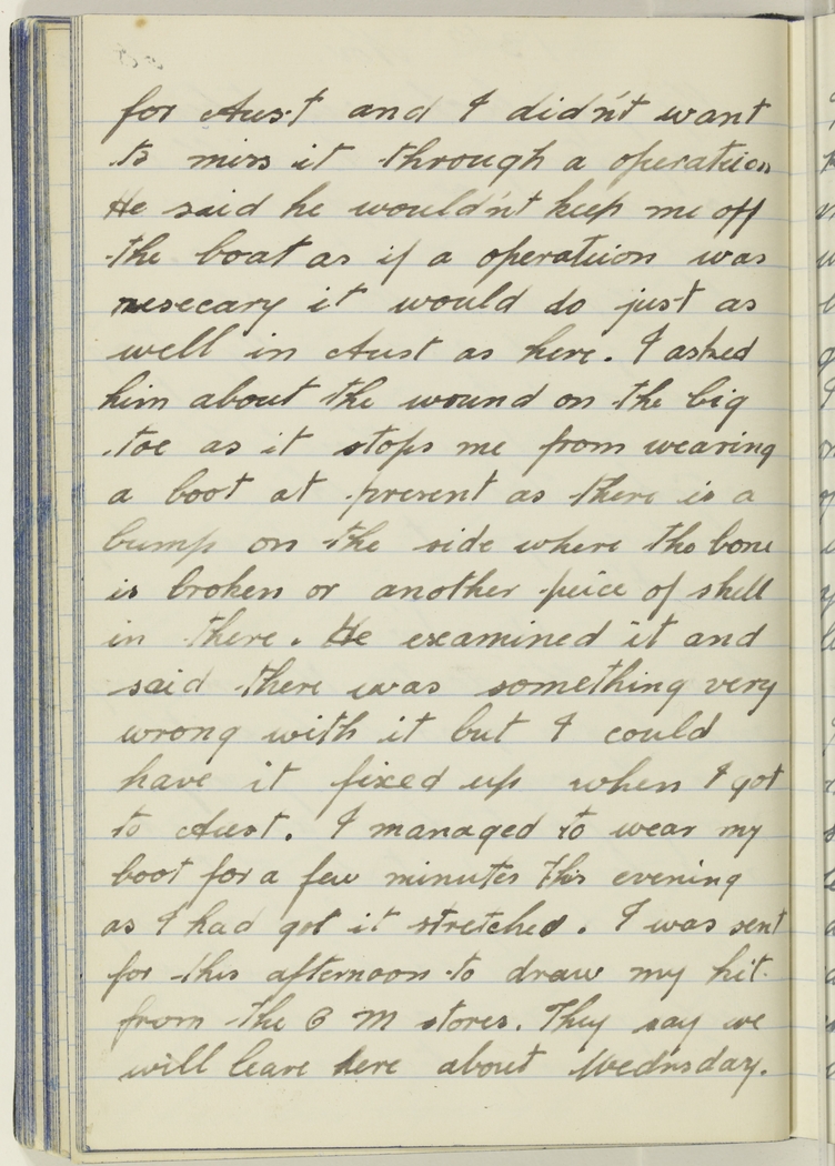 for Aust. and I did'nt want to miss it through a operateion. He said he would'nt keep me off the boat as if a operateion was nesecary it would do just as well in Aust. as here. I asked him about the wound on the big toe as it stops me from wearing a boot at present as there is a bump on the side where the bone is broken or another peice of shell in there. He examined it and said there was something very wrong with it but I could have it fixed up when I got to Aust. I managed to wear my boot for a few minutes this evening as I had got it stretched. I was sent for this afternoon to draw my kit from the Q.M. stores. They say we will leave here about Wednsday.