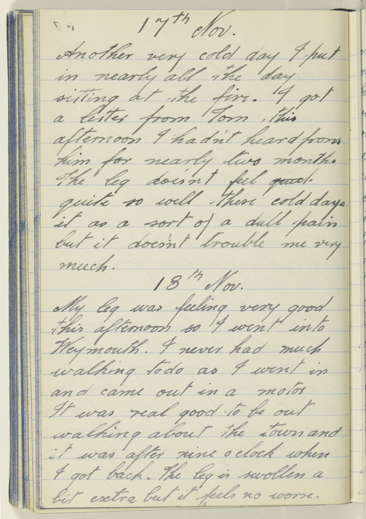 My leg was feeling very good this afternoon so I went into Weymouth. I never had much walking to do as I went in and came out in a motor. It was real good to be out walking about the town and it was after nine oclock when I got back. The leg is swollen a bit extra but it feels no worse.