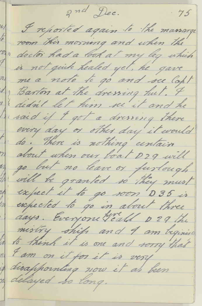 I reported again to the massarge room this morning and when the doctor had a look at my leg which is not quite healed yet, he gave me a note to go and see Capt Barton at the dressing hut. I did'nt let him see it and he said if I got a dressing there every day or other day it would do.