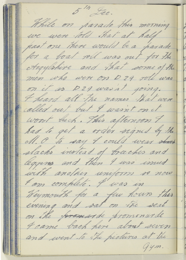While on parade this morning we were told that at half past one there would be a parade for a boat roll was out for the Argylshire [Argyleshire] and that some of the men who were on D29 roll was on it as D29 was'nt going. I heard all the names that were called out but I was'nt on it worst luck. This afternoon I had to get a order signed by the M.O. to say I could wear slacks instead of breeches and leggens and then I was issued with another uniform so now I am complete. I was in Weymouth for a few hours this evening and sat on the seat on the promarde promenarde. I came back here about seven and went to the pictures at the Gym.