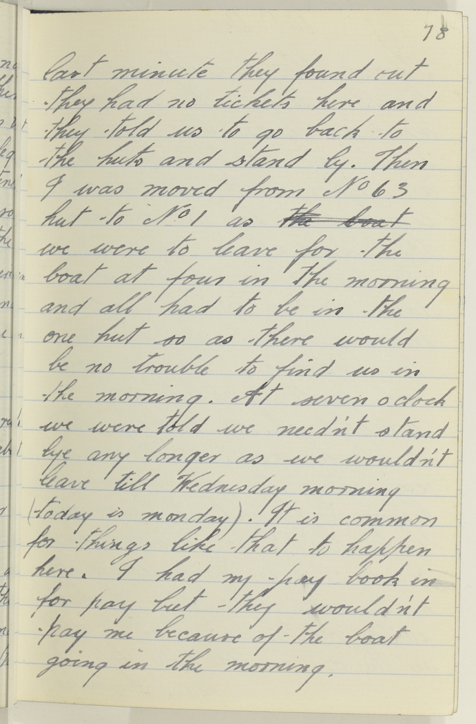 Then I was moved from No 63 hut to No 1 as the boat we were to leave for the boat at four in the morning and all had to be in the one hut so as there would be no trouble to find us in the morning. At seven oclock we were told we need'nt stand bye any longer as we would'nt leave till Wednesday morning (today is Monday). It is common for things like that to happen here. I had my pay book in for pay but they would'nt pay me because of the boat going in the morning.