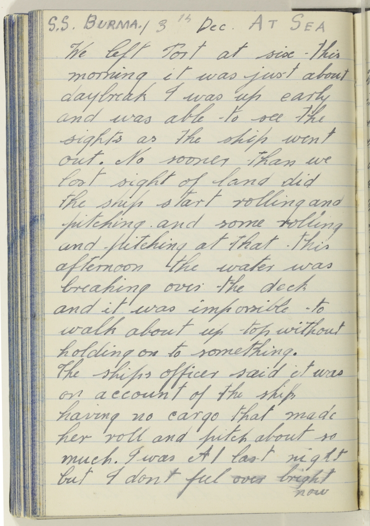 We left Port at six this morning it was just about daybreak I was up early and was able to see the sights as the ship went out.  No sooner than we lost sight of land did the ship start rolling and pitching and some rolling and pitching at that. This afternoon the water was breaking over the deck and it was impossible to walk about up top without holding on to something. The ships officer said it was on account of the ship having no cargo that made her roll and pitch about so much. I was A1 last night but I dont feel over bright now.
