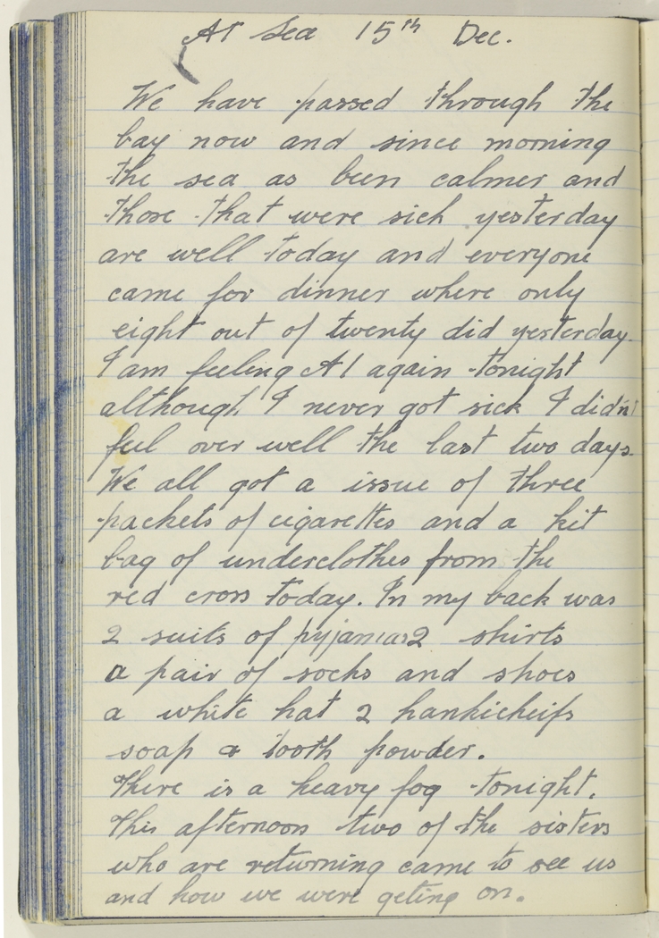 We have passed through the bay now and since morning the sea as been calmer and those that were sick yesterday are well today and everyone came for dinner where only eight out of twenty did yesterday. I am feeling A1 again tonight although I never got sick I did'nt feel over well the last two days.