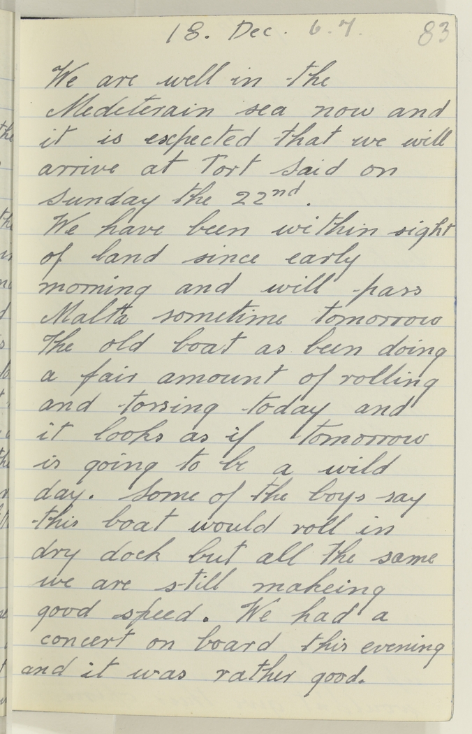 We are well in the Medeterain [Mediterranean] sea now and it is expected that we will arrive at Port Said on Sunday the 22nd.