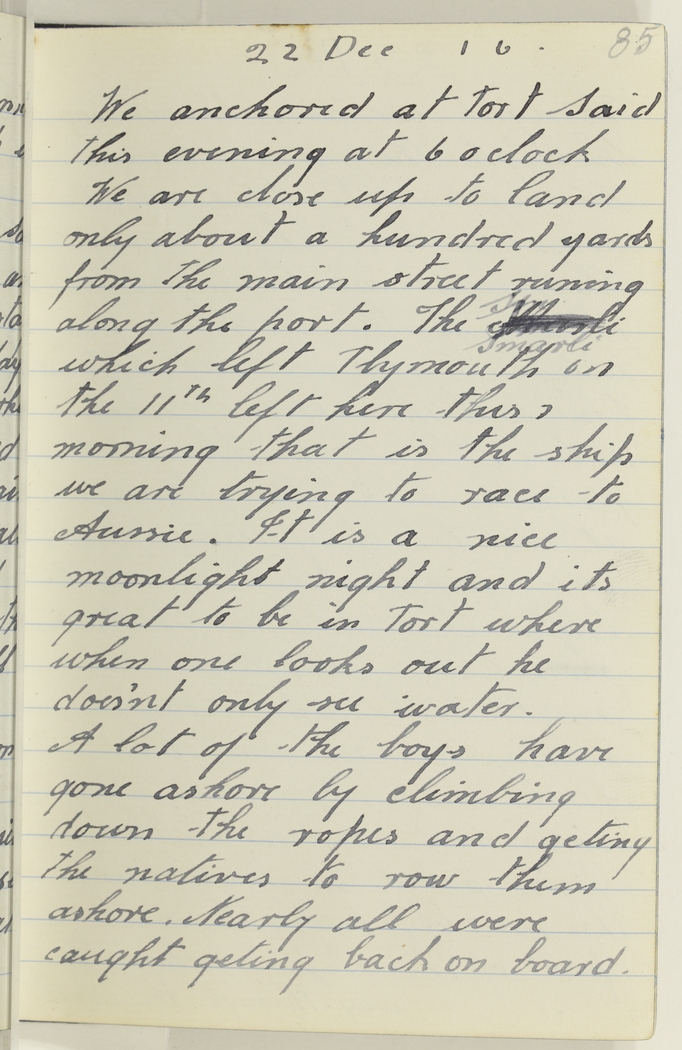 We anchored at Port Said this evening at 6 o clock We are close up to land only about a hundred yards from the main street runing along the port. The Smarli [Somali] which left Plymouth on the 11th left here this morning that is the ship we are trying to race to Aussie. It is a nice moonlight night and its great to be in Port where when one looks out he does'nt only see water. A lot of the boys have gone ashore by climbing down the ropes and geting the natives to row them ashore. Nearly all were caught geting back on board.