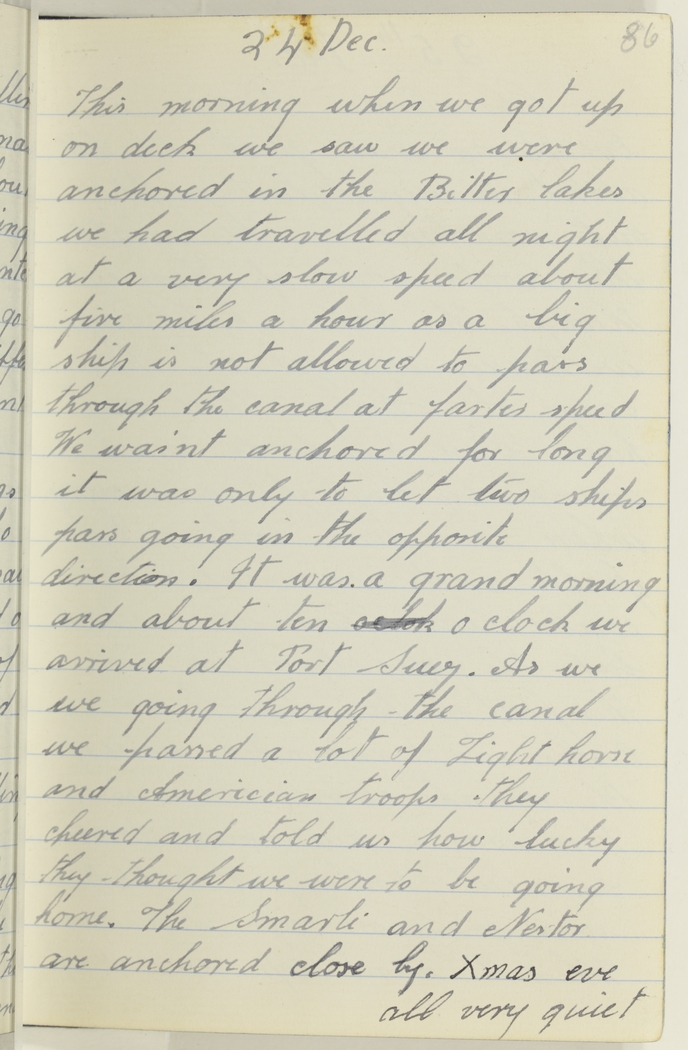 It was a grand morning and about ten oclok o clock we arrived at Port Suez. As we we going through the canal we passed a lot of Light horse and Americian troops. They cheered and told us how lucky they thought we were to be going home. The Smarli [Somali] and Nestor are anchored close by. Xmas eve all very quiet.