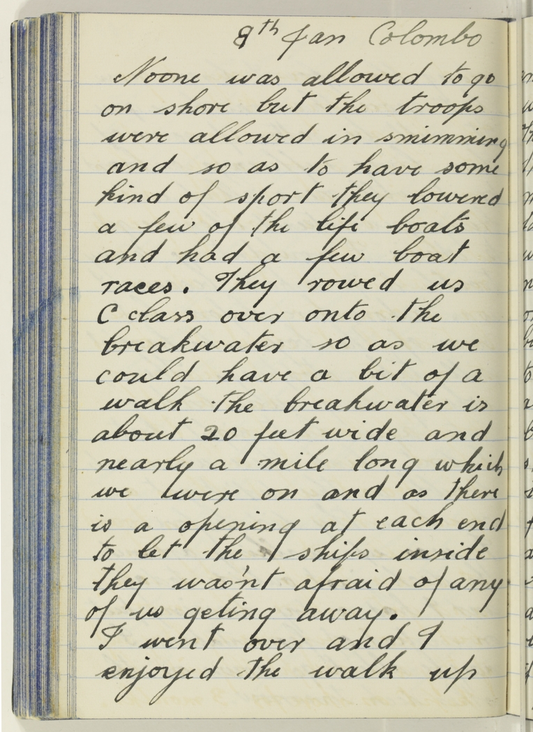Noone was allowed to go on shore but the troops were allowed in smimming and so as to have some kind of sport they lowered a few of the life boats and had a few boat races. They rowed us C class over onto the breakwater so as we could have a bit of a walk. The breakwater is about 20 feet wide and nearly a mile long which we were on and as there is a opening to each end to let the ships inside they was'nt afraid of any of us geting away. I went over and I enjoyed the walk up