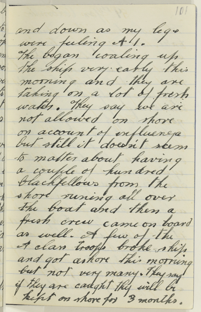 The began coaling up the ship very early this morning and they are taking on a lot of fresh water. They say we are not allowed on shore on account of enfluenza but still it does'nt seem to matter about having a couple of hundred blackfellows from the shore runing all over the boat and then a fresh crew came on board as well.  A few of the A class troops broke ship and got ashore this morning but not very many. They say if they are caught they will be kept on shore for 3 months.