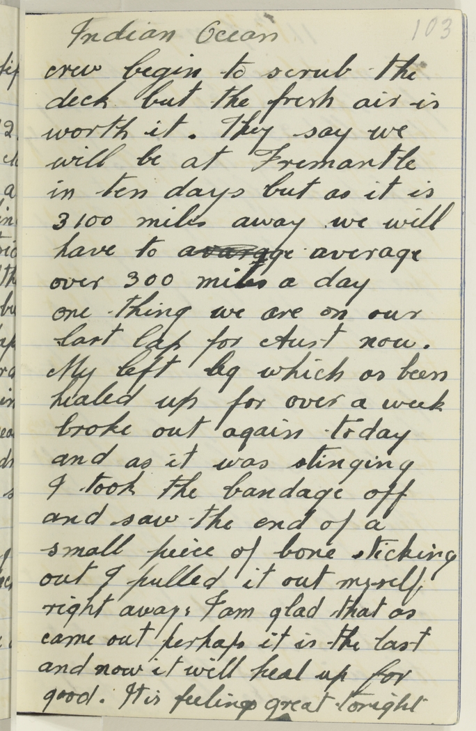 crew begin to scrub the deck but the fresh air is worth it. They say we will be at Fremantle in ten days but as it is 3100 miles away we will have to avarage average over 300 miles a day. One thing we are on our last lap for Aust now.