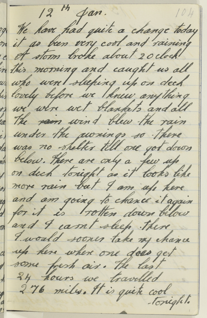 We have had quite a change today, it as been very cool and raining. A storm broke about 2 o clock this morning and caught us all who were sleeping up on deck lovely before we knew anything we were wet blankets and all. The rain wind blew the rain under the awnings so there was no shelter till one got down below. There are only a few up on deck tonight as it looks like more rain but I am up here and am going to chance it again for it is rotten down below and I carnt sleep there I would sooner take my chance up here where one does get some fresh air. The last 24 hours we travelled 276 miles. It is quite cool tonight.