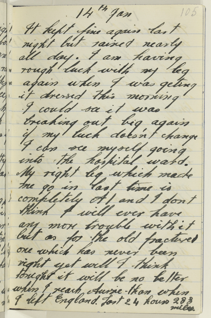 It kept fine again last night but rained nearly all day.  I am having rough luck with my leg again, when I was geting it dressed this morning I could see it was breaking out big again.  If my luck does'nt change I can see myself going into the hospital ward. My right leg which made me go in last time is completely A1 and I dont think I will ever have any more trouble with it but as for the old fractured one which has never been right yet well I think tonight it will be no better when I reach Aussie than when I left England.  Last 24 hours 288 miles.