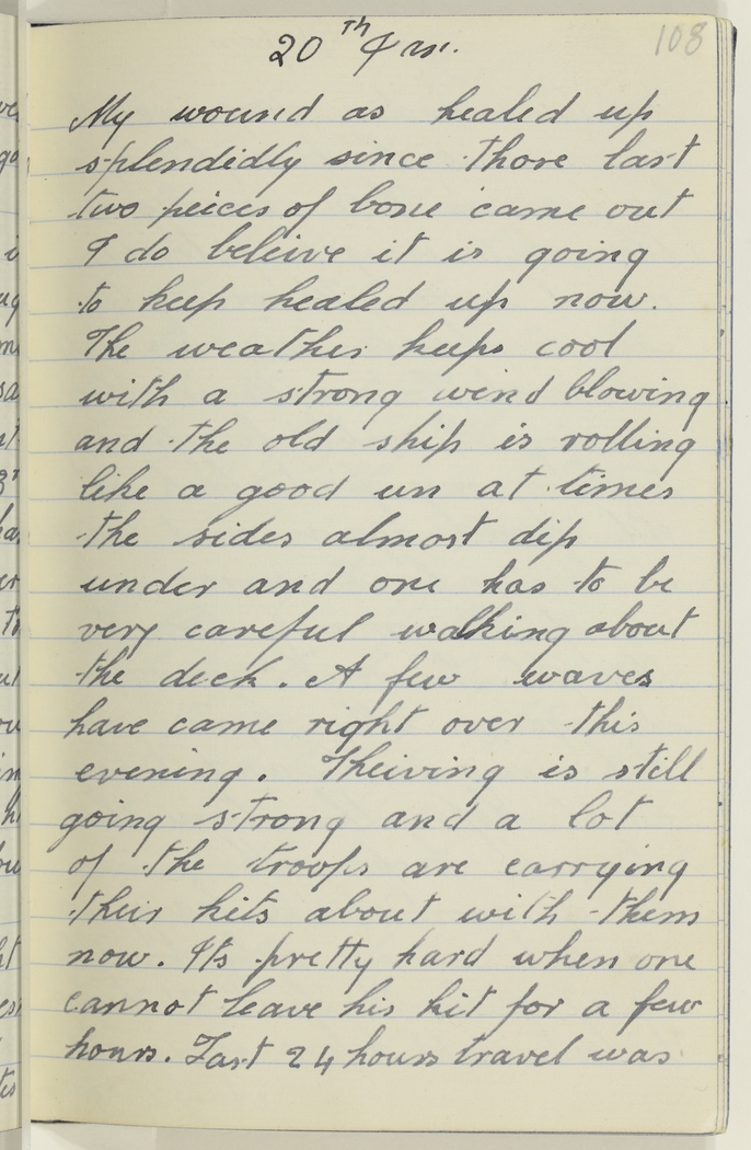 The weather keeps cool with a strong wind blowing and the old ship is rolling like a good un at times the sides almost dip under and one has to be very careful walking about the deck. A few waves have come right over this evening.